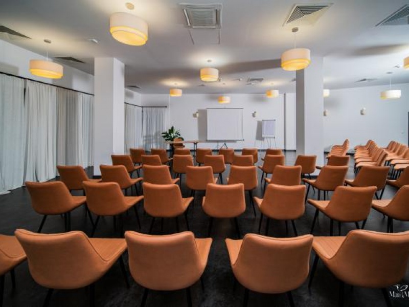 Dysponujemy przestronną salą konferencyjną o wielkości ok. 300 m2, podzielną przez ściany modułowe na trzy mniejsze powierzchnie. Ściany umożliwiają dowolną konfigurację przestrzeni. Ich elastyczny układ pozwala na zorganizowanie równolegle kilku spotkań, szkoleń czy wykładów albo jednej dużej konferencji. W sali konferencyjnej możemy zorganizować spotkanie dla około 250 osób w ustawieniu teatralnym oraz uroczysty bankiet dla około 200 osób. Do dyspozycji oddajemy również przestronne foyer przylegające do sal konferencyjnych.Wszystkie sale są klimatyzowane. Do dyspozycji naszych Klientów w cenie wynajmu sali oddajemy sprzęt multimedialny i audiowizualny: projektor, ekran, mikrofony bezprzewodowe, flipchart z markerami, wskaźnik laserowy, Wi-Fi.